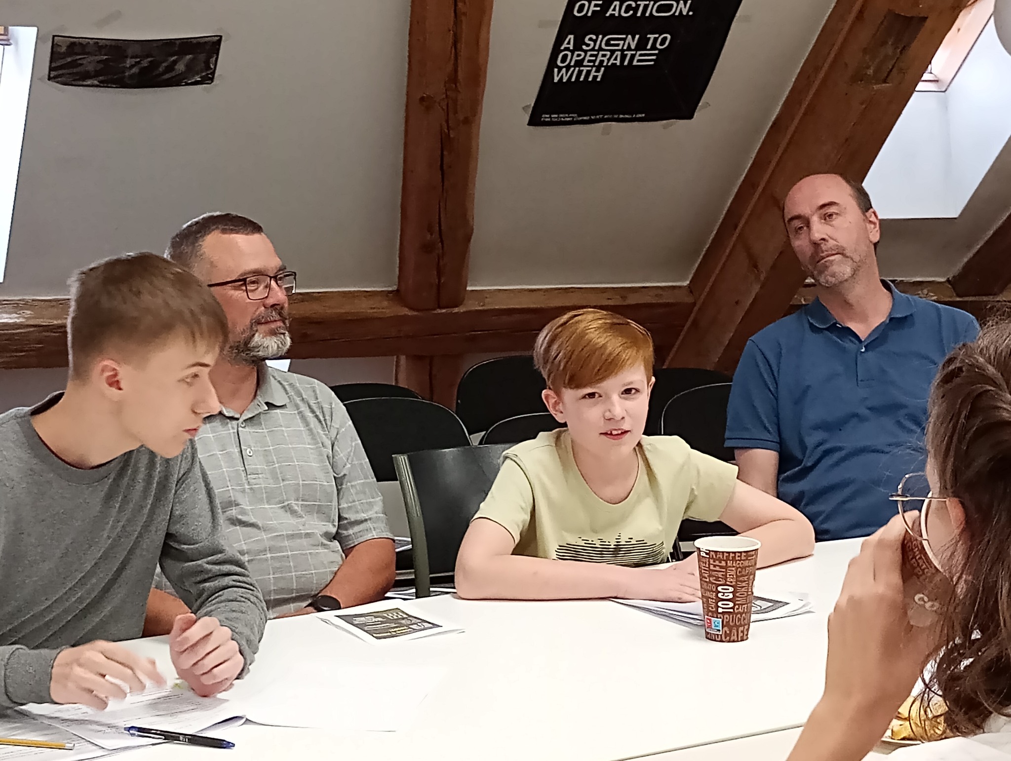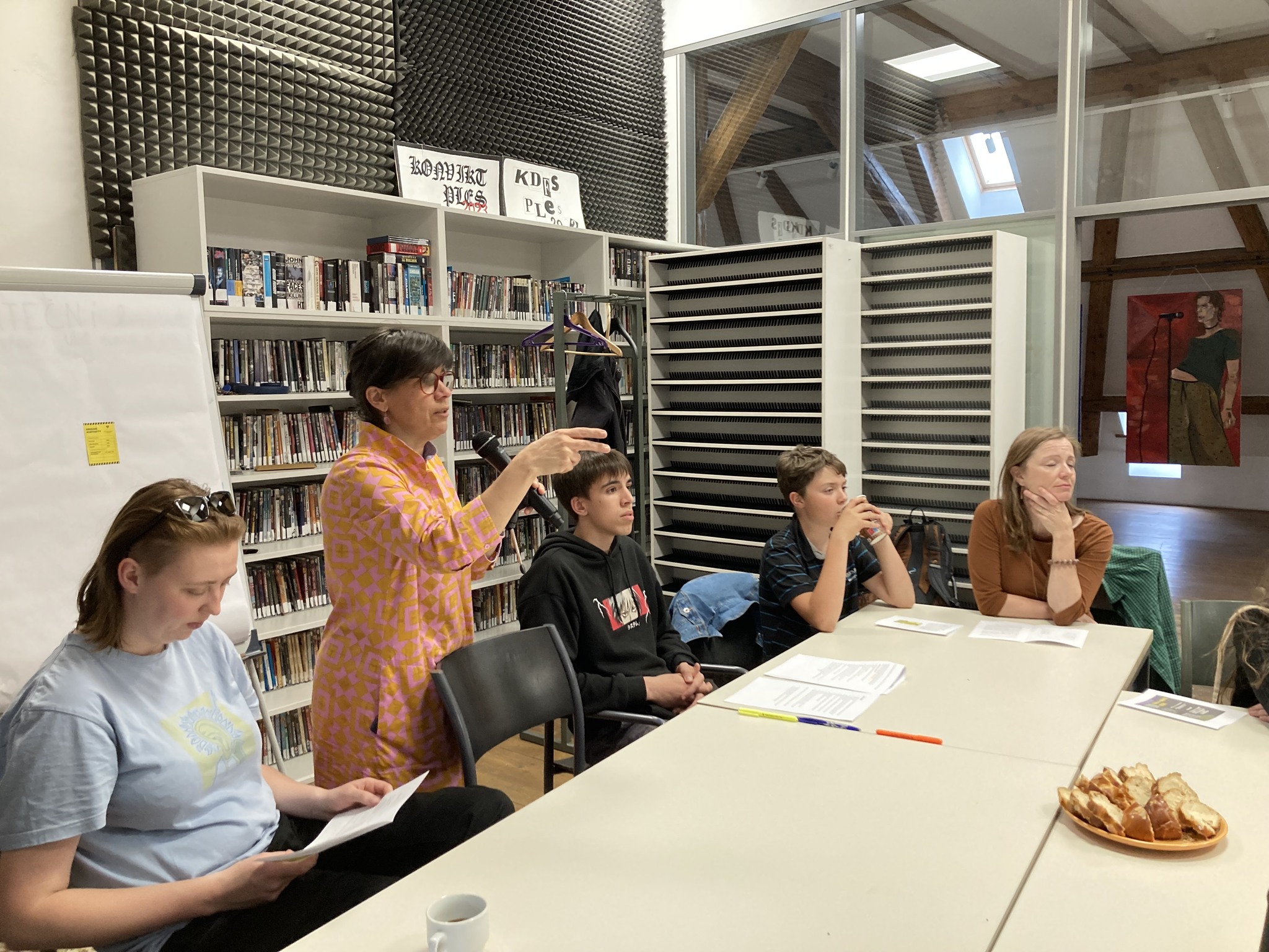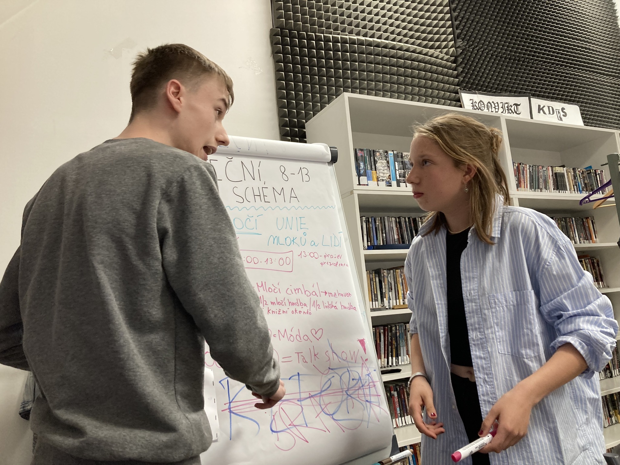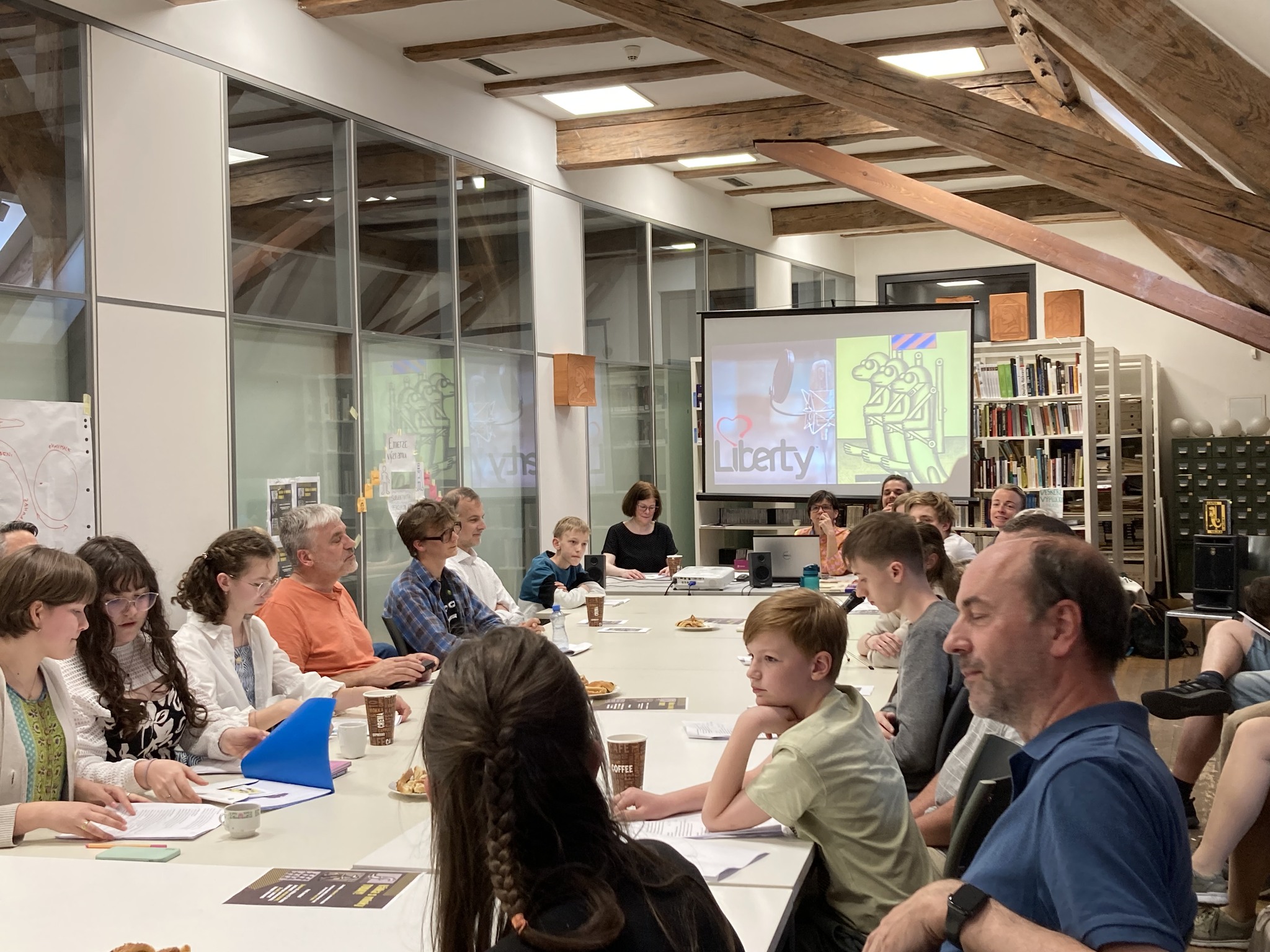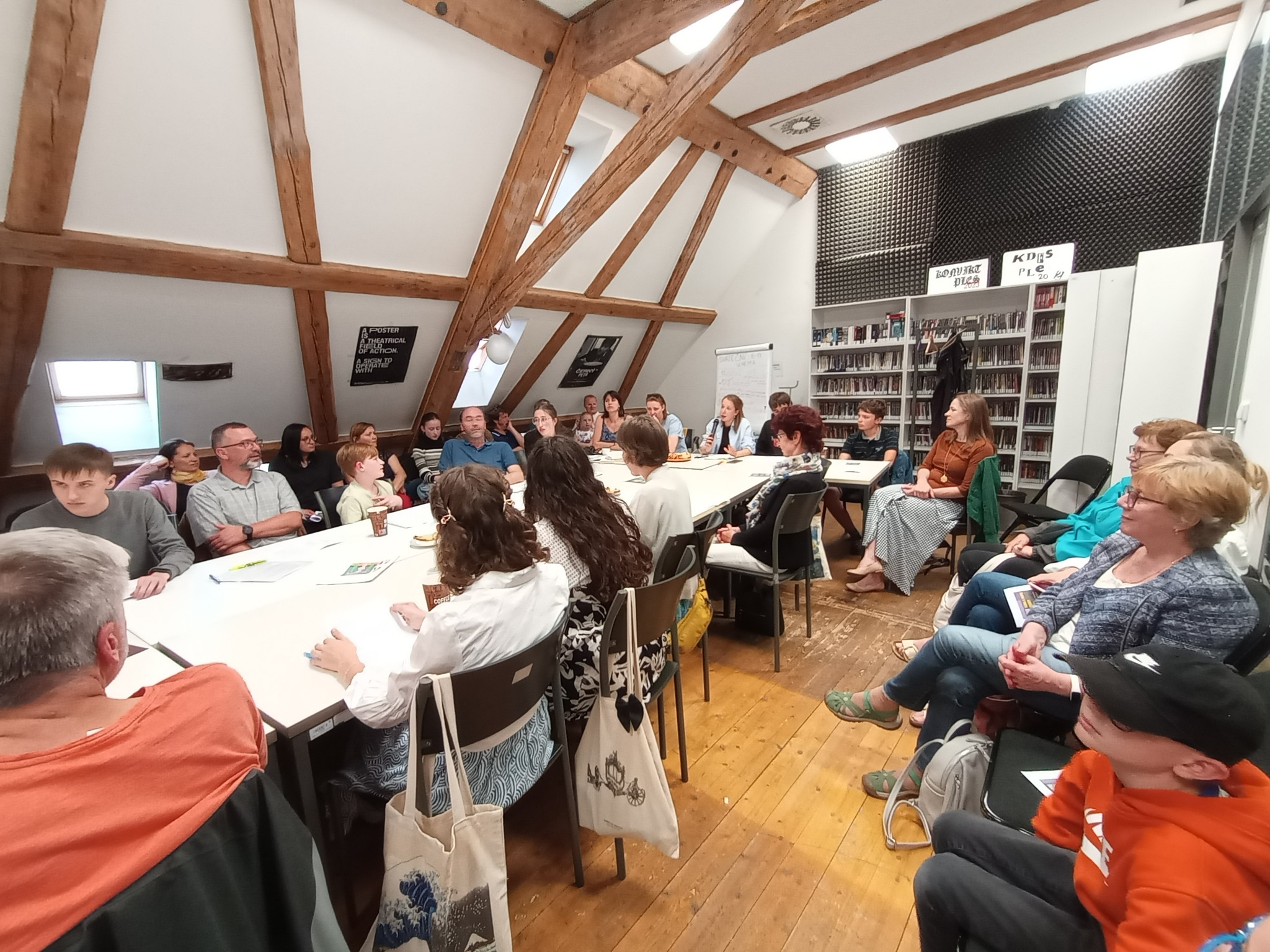 - Hrajeme v jakémkoli prostoru, kam se vejde dlouhý stůl. Potřebujeme flipchart, projektor a projekční plochu. Diváci sedí s námi u stolu nebo v řadě těsně za židlemi. Umíme se přizpůsobit jakémukoli prostoru. Můžete si nás pozvat do školní třídy nebo jídelny.