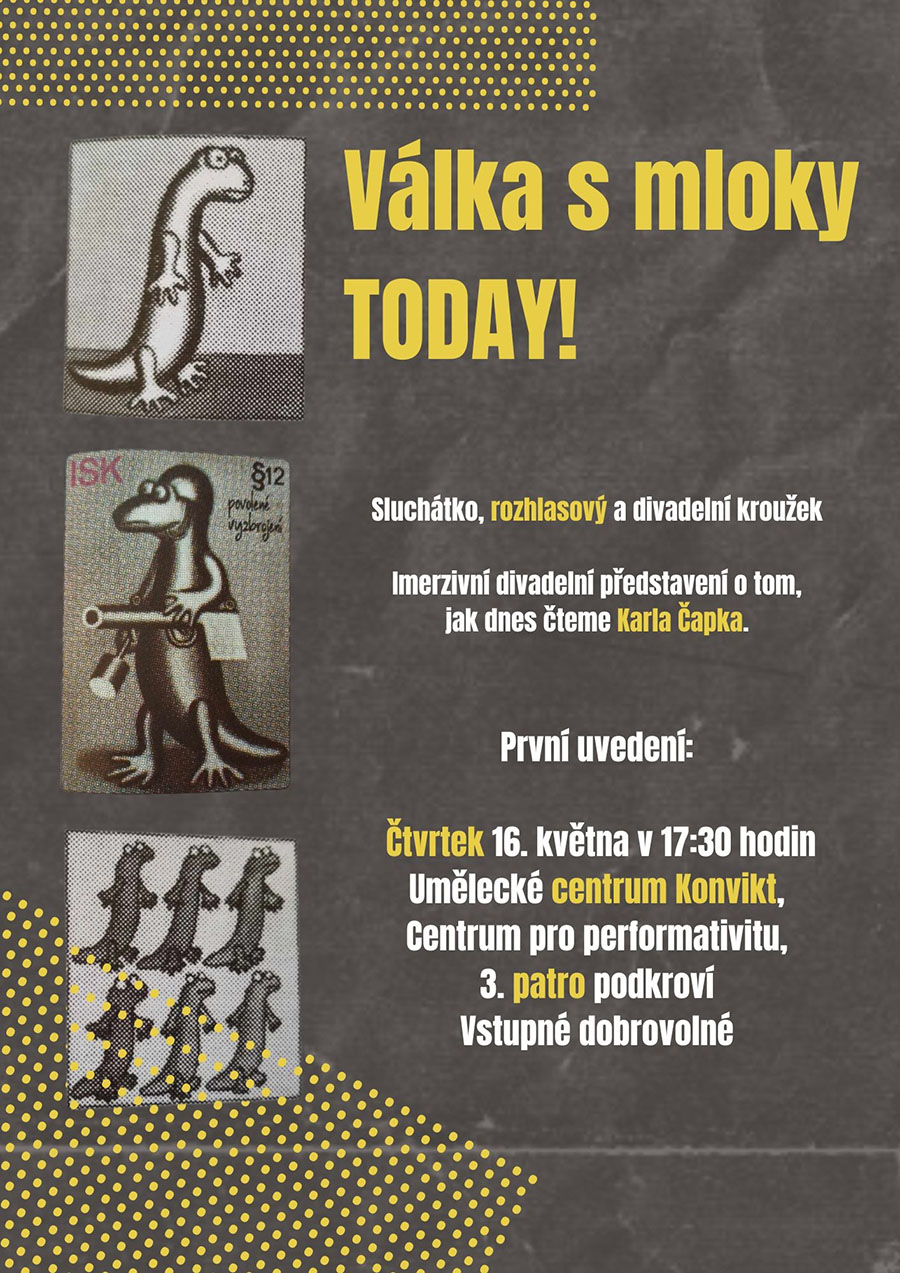 Na jedné zkoušce jsme zkombinovali hraní oblíbené hry Mafie (Městečko Palermo) a téma mloků. A vznikl rámec toho, co při představení zažijete. Poloimprovizované hraní na téma Čapkovy knihy zasazené do dnešních dnů. V komunikaci jednotlivých aktérů zůstaly zbytky z různých verzí. Postavy si tykají i vykají, někteří jsou redaktoři „ze starých časů“, někdo se inspiroval rozhlasovou hrou z roku 1958, jiní zůstávají sami nebo samy sebou.